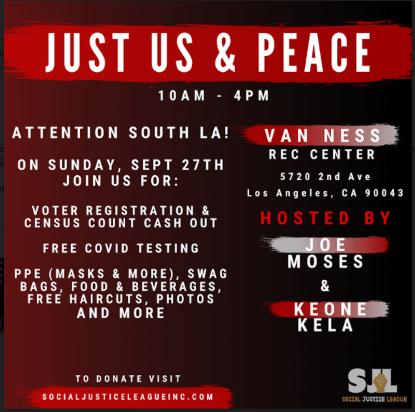 Join us Sunday, September 27th from 10am - 4pm to register to vote, get counted for the census, receive free COVID-19 testing, and to get FREE haircuts, PPE masks & health supplies, and swag from The LA Clippers, Gatorade, Cote Quest, and more!